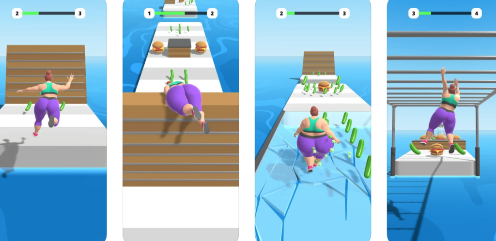 The concept is pretty simple. You start off as a large person and the idea is to get as slim as possible. To do this, you need to collect all of the healthy cucumbers and avoid the burgers. The burgers will make you bigger but the cucumbers will tone you up and score you some coins!