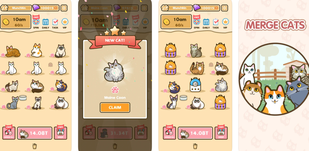 Start with kittens. Merge your kittens to upgrade them! Collect coins to purchase more kinds of cute cats.
